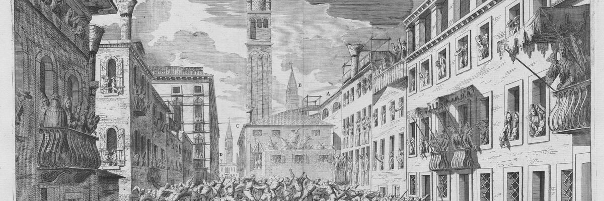 Veduta del Canale e della Chiesa di San Barnaba con in primo piano una lotta sul Ponte dei Pugni